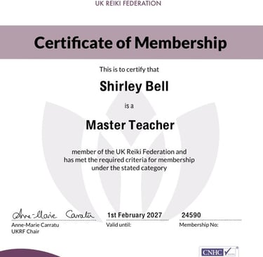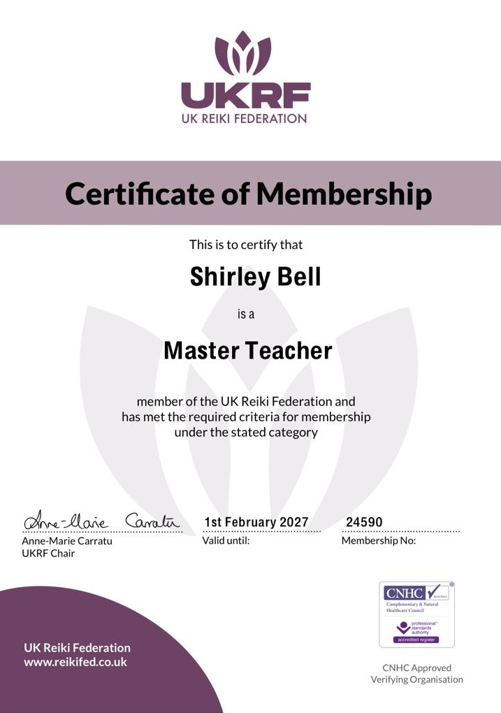 Shirley Bell is now officially recognised as a Registered Master Teacher with the UK Reiki Federation (UKRF), a respected professional body that upholds high standards within Reiki practice and teaching across the UK.